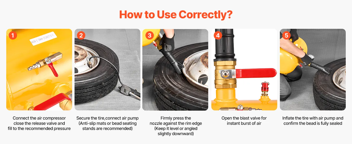 Instant Inflation: This tire bead seater boosts tire-changing efficiency, saving time and effort. By instantly releasing high-pressure air, it forces the tire bead back into the rim groove, completing bead seating quickly and reliably