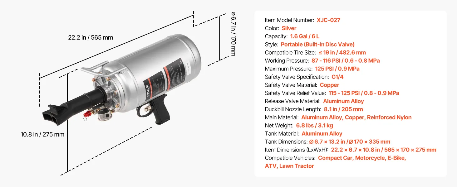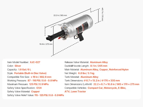 • Tire Compatibility: 1.6 Gal / 6 L cylinder, fits tubeless tires ≤ 19 in / 482.6 mm. Operating pressure: 87–116 PSI / 0.6–0.8 MPa. Suitable for cars, motorcycles, SUVs, pickups, lawn tractors, and travel trailers