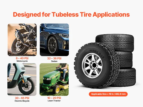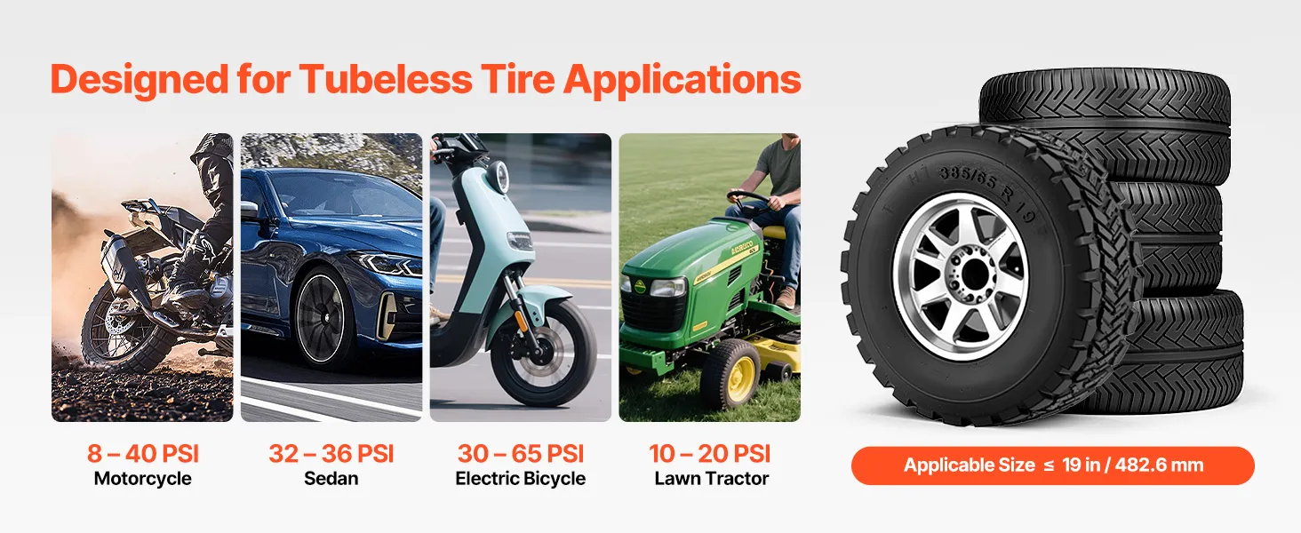 Supports tubeless tires ≤ 19 in / 482.6 mm, including small cars, motorcycles, e-bikes, ATVs, and lawn mowers. Operating pressure: 87–116 PSI / 0.6–0.8 MPa. Adjust inflation according to tire size.