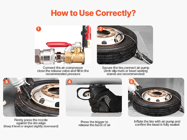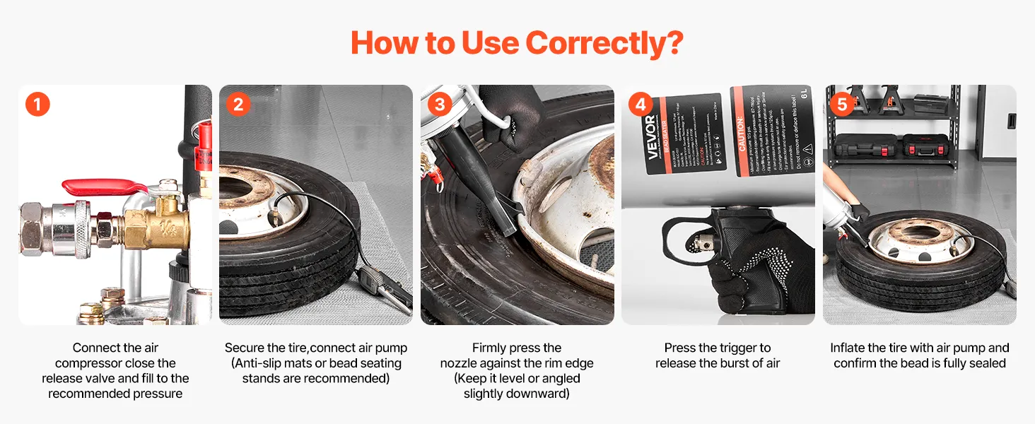 Fill the cylinder with an air compressor to working pressure. Place the tire horizontally and stable, press the nozzle against the rim edge, and trigger the exhaust. Use a non-slip mat for small tires or a bead-seating platform for large tires.