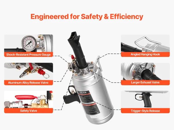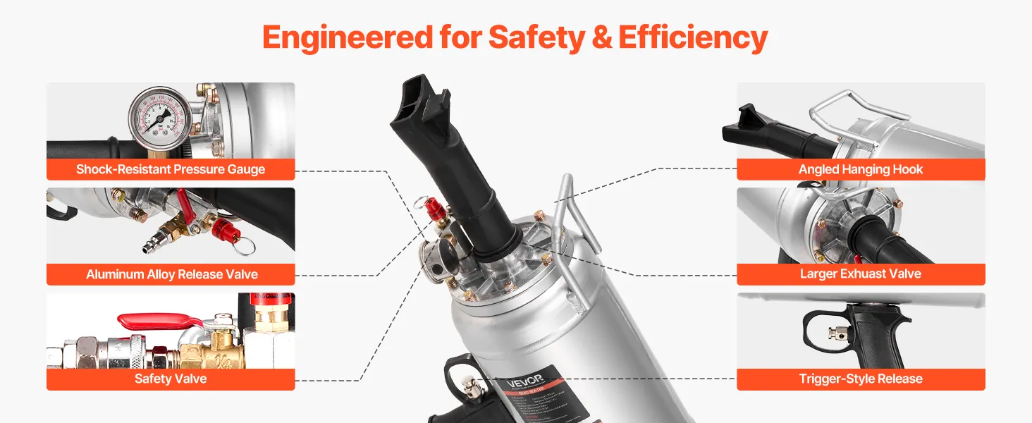 • Security Features: Aluminum alloy cylinder resists deformation and leakage over long-term use. The bead blaster is equipped with a safety valve that automatically releases excess pressure beyond the max working limit. Long-neck design keeps a secure distance