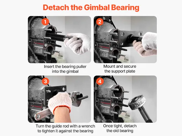 The gimbal bearing puller installer features a fixed end ring that aligns with the old bearing position. The heat-treated screw ensures firm attachment, reducing vibration and improving hammering force during installation.