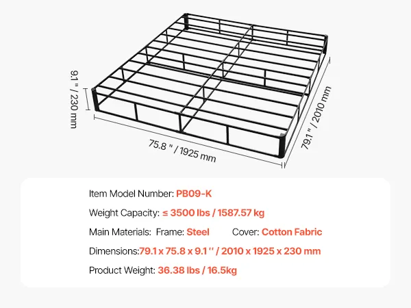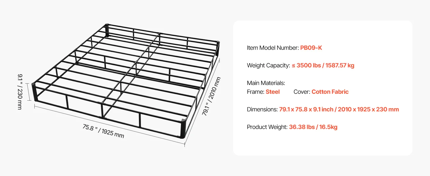 VEVOR Box Spring, King Size Bed Frame with Washable Fabric Cloth, Heavy Duty Metal Frame for King Bed, 9 in Mattress Foundation, 3500 lbs Max Weight Capacity, Easy Assembly, 79.1 L x 75.8 W x 9.1 H in