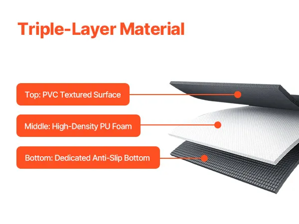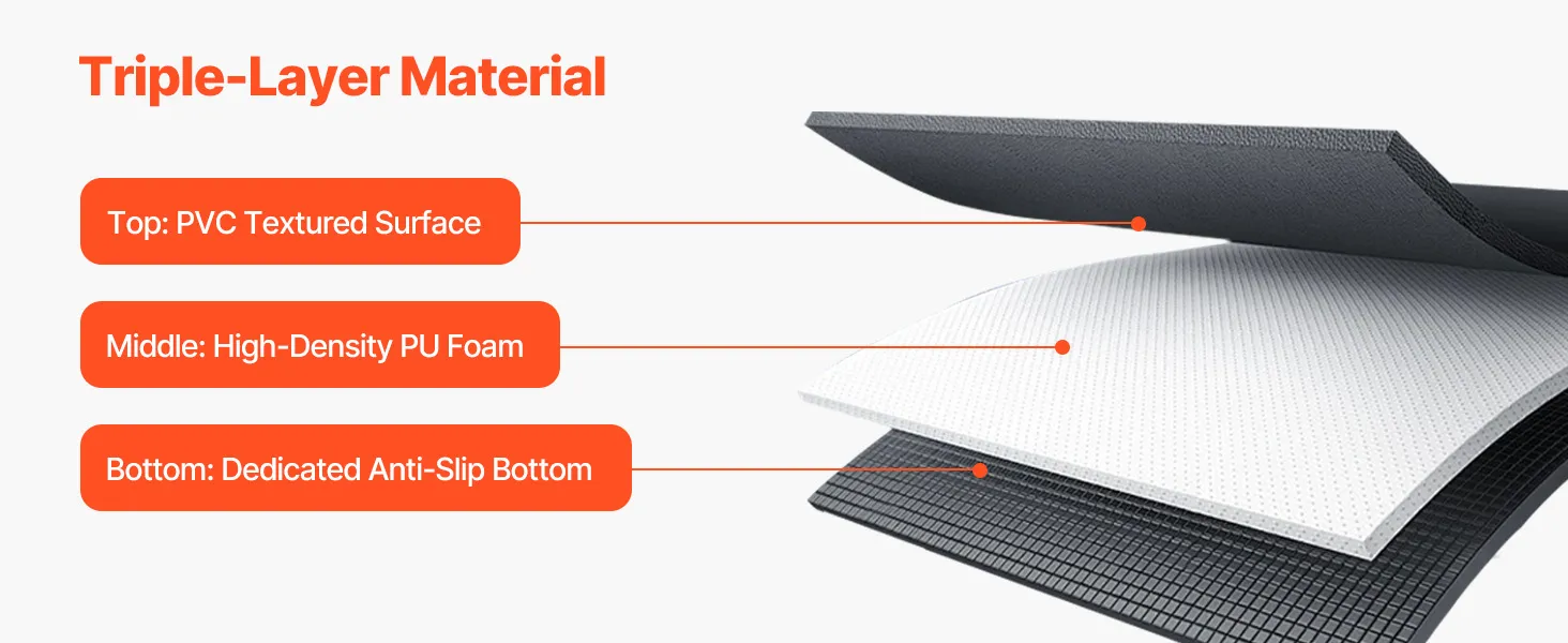 This fall protection mat is crafted with a triple-layer design: the top layer features a durable PVC textured surface, the middle layer is made of high-density PU foam for impact absorption, and the bottom layer is equipped with an anti-slip design to ensure stability on various surfaces.