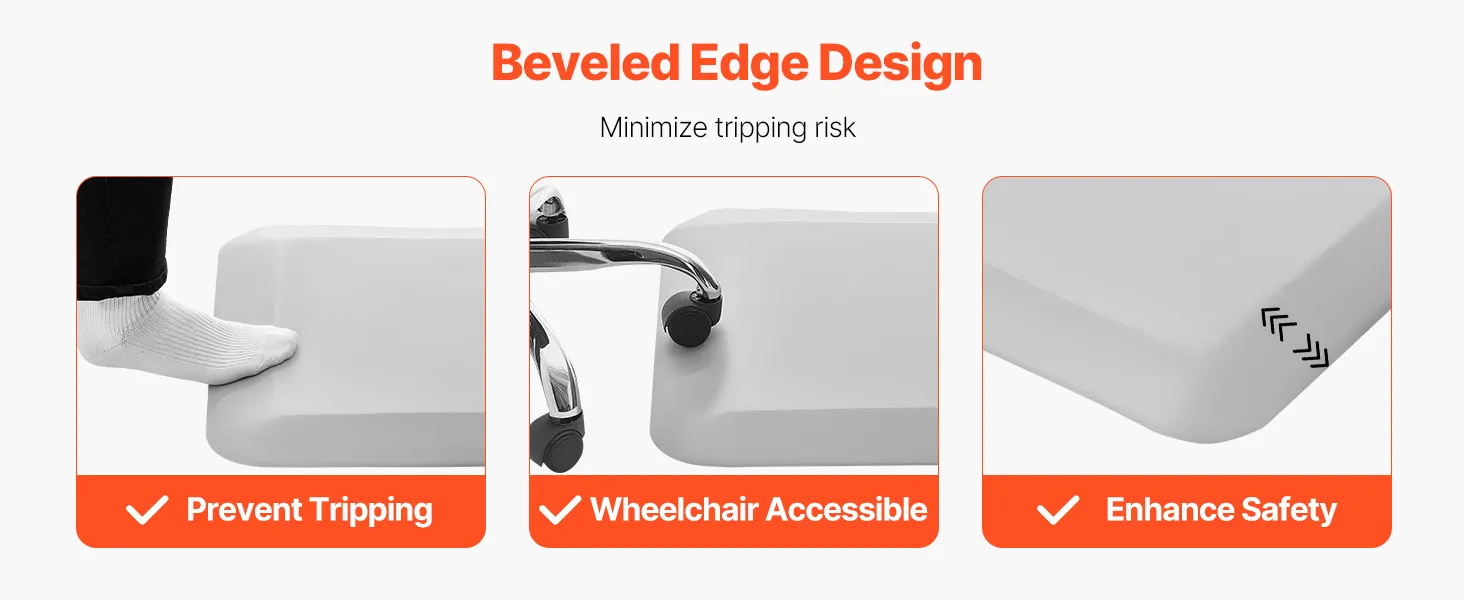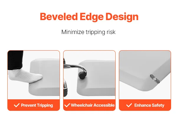 This fall protection mat features a beveled edge design that effectively prevents tripping, and ensures easy access for wheelchairs and other mobility devices, reducing the risk of falls and offering a safer user experience.
