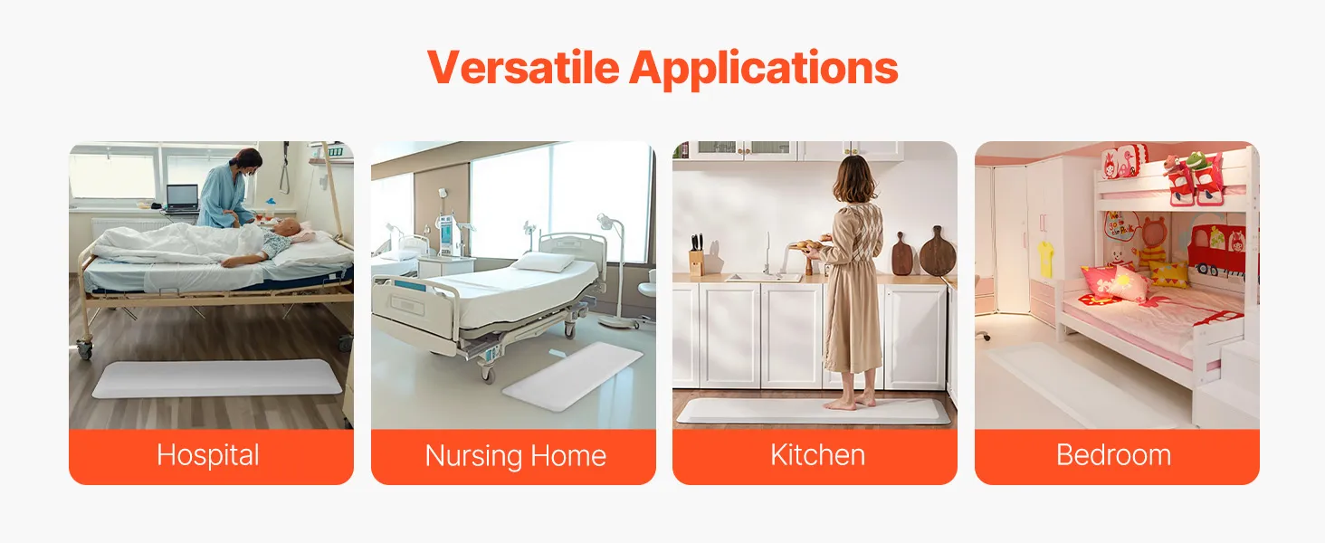 Our fall mat for eldelry is suitable for various settings, whether in hospitals, nursing homes, kitchens, or bedrooms. It helps reduce the risk of falls for the elderly and those with limited mobility, ensuring a safer daily life.