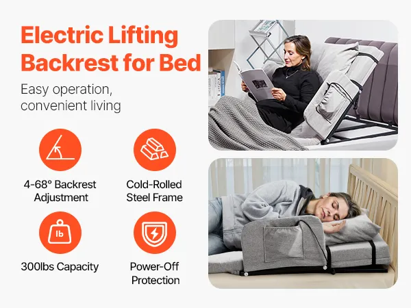 This power lifting bed backrest adjusts from 4° to 68°, featuring a 2.4" thick foam cushion, adjustable footrest, and fixed pillow. The washable headrest, detachable guardrail, storage pouch, and 300lb capacity steel frame ensure comfort, convenience, and stability. Ideal for various scenes.