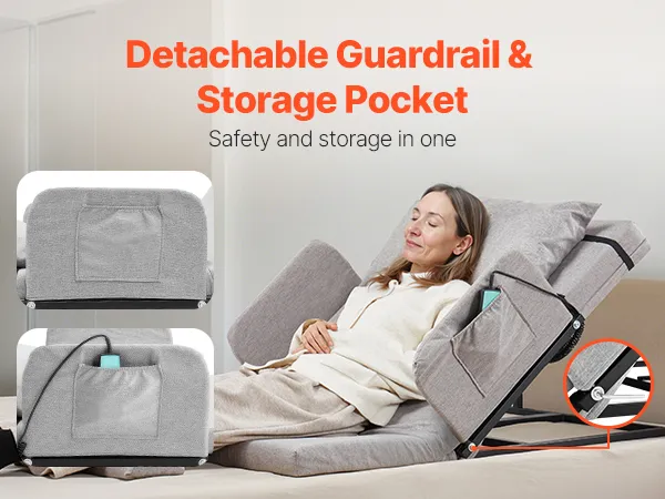 The lifting bed backrest includes a detachable guardrail, securely fastened with screws to provide extra support and protection, especially when getting up or lying down. The built-in storage pouch offers convenient storage and easy access.