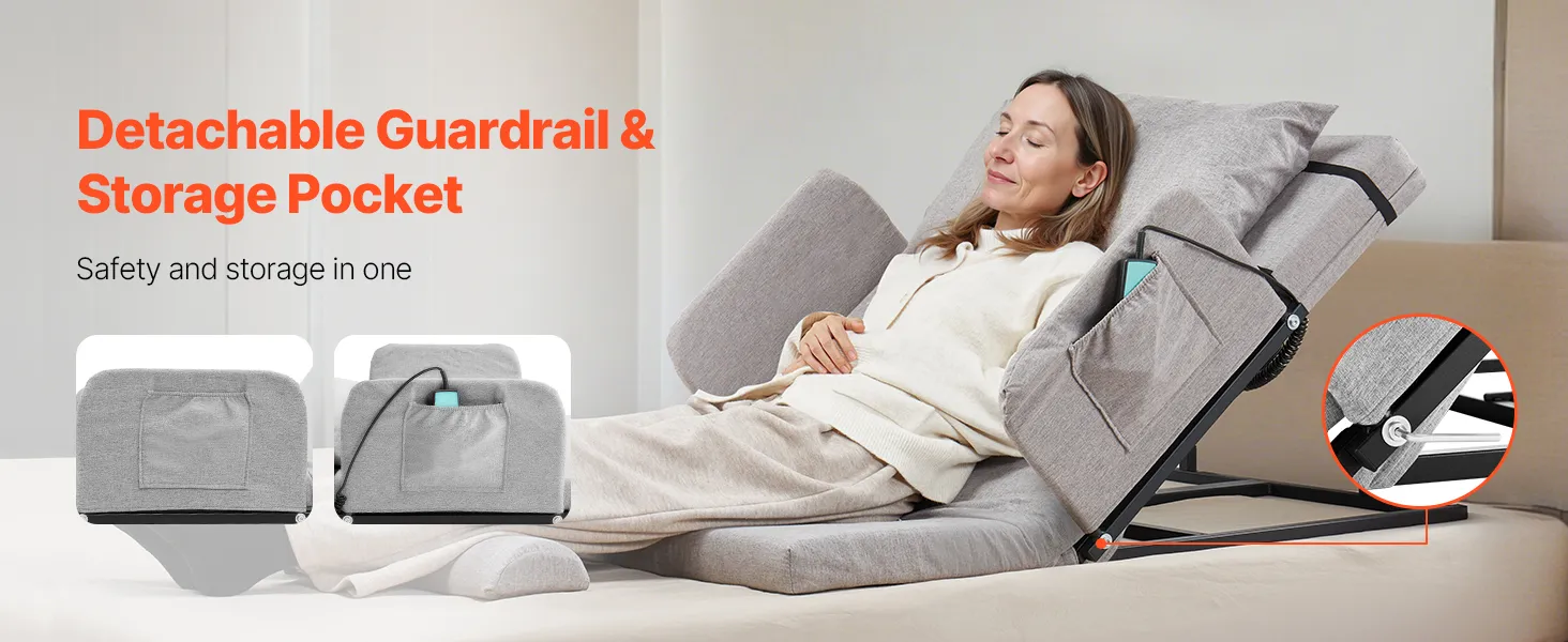 Comfort Upgrade: This lifting bed backrest comes with a 2.4"/6 cm thick foam cushion, footrest support, fixed pillow position, detachable guardrail, and a handy storage pouch, making it even more convenient for everyday use.