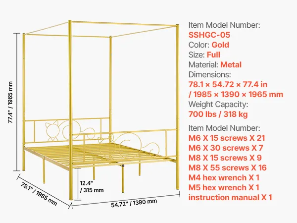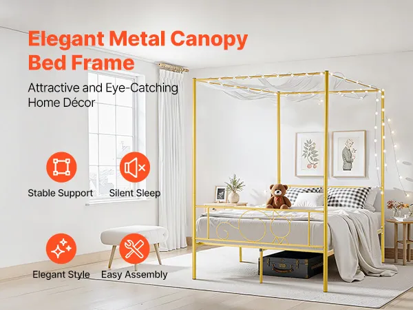 Sturdy Metal Construction: Our canopy bed features a reinforced metal frame with a four-post canopy design and strengthened slats to avoid mattress sagging. Supports up to 700 lbs / 318 kg for reliable stability