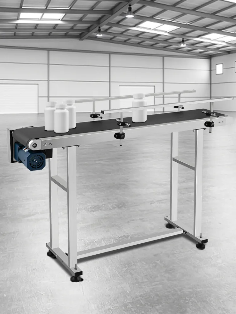 There are also guardrails on both sides to keep items from falling off the conveyor belt. Adjust the height of the guardrail according to the product's actual characteristic to ensure the transmission's stability. Height Range: 0-15 cm / 0-6 inches.