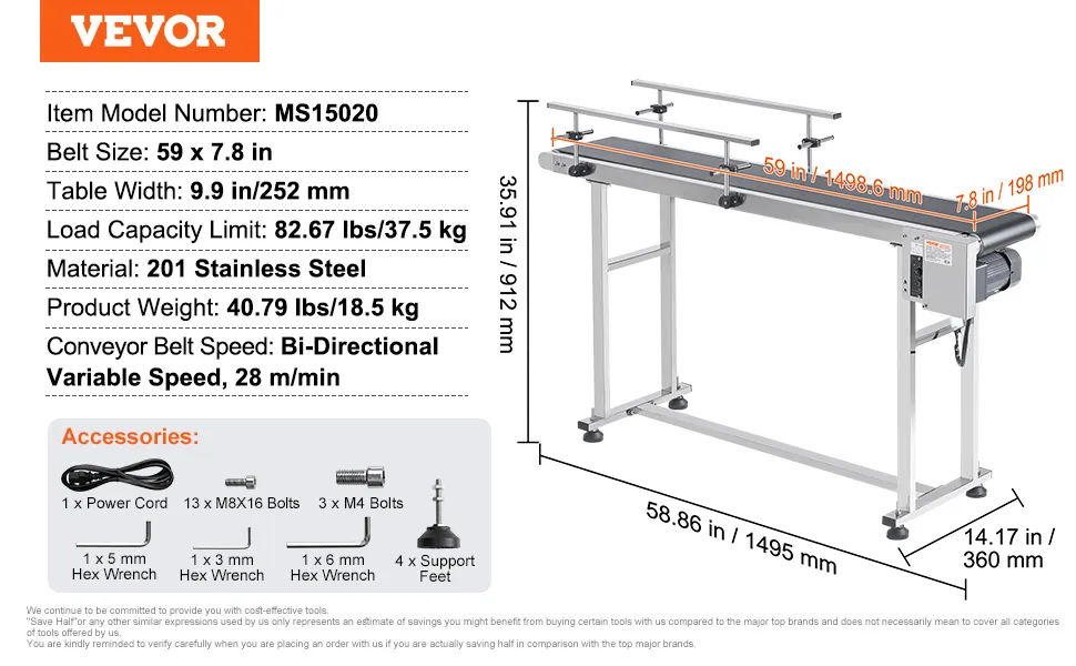 VEVOR Belt Conveyor, 1498.6 x 198.1 mm Conveyor Table Heavy Duty Stainless Steel Motorized Belt Conveyor for Inkjet Coding Applications Powered PVC Belt Anti-Static Adjustable Speed (Double Guardrail)