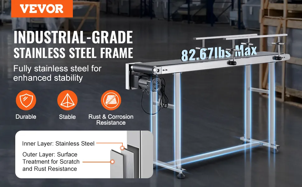 Say goodbye to flimsy conveyors! Our belt conveyor boasts a solid stainless steel structure that ensures stability and durability, handling heavy loads and long hours like a pro. Plus, its scratch-resistant and rust-proof exterior keeps it going strong even in tough conditions.