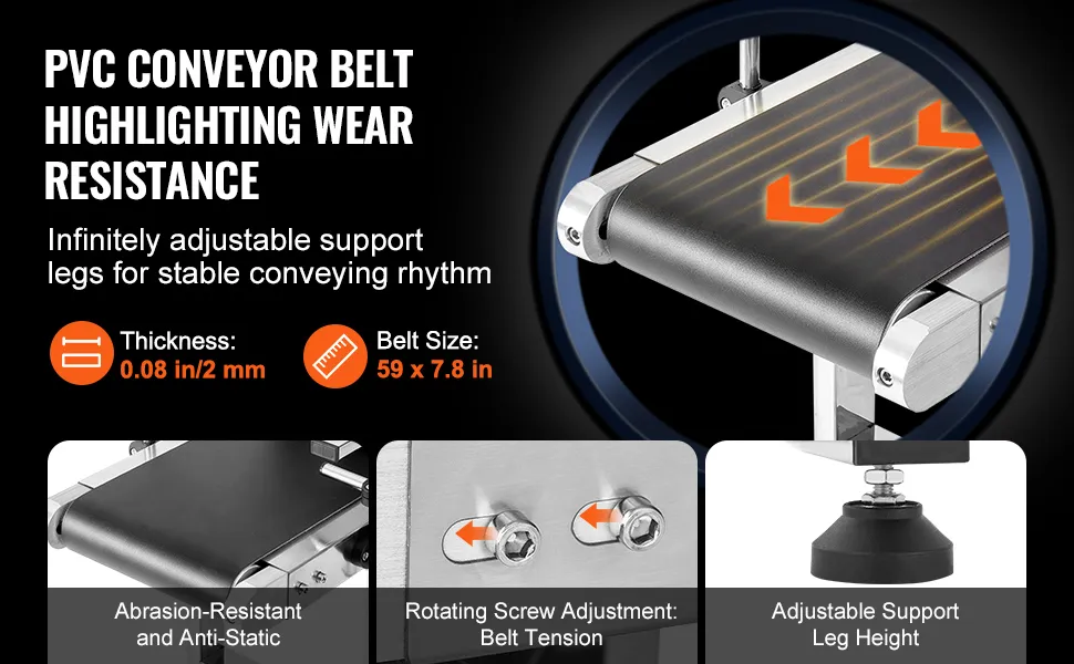 PVC Conveyor Belt: With wear-resistant and anti-static properties, this PVC flat conveyor belt, measuring 59" x 7.8" and 0.08" thick, efficiently handles items of various sizes. The rotating screw provides precise adjustment of belt tension, while infinitely adjustable support feet ensure the belt remains stable in any working environment.