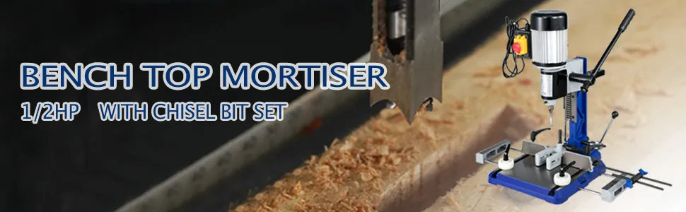Bench Top Mortise with Table Extensions. Powerful 1/2HP, 1400RPM Motor quickly cuts mortises in the toughest woods without stalling. Dovetail Column Ways with adjustable stop for solid, consistent cutting of multiple mortises. For furniture making or other industrial use.