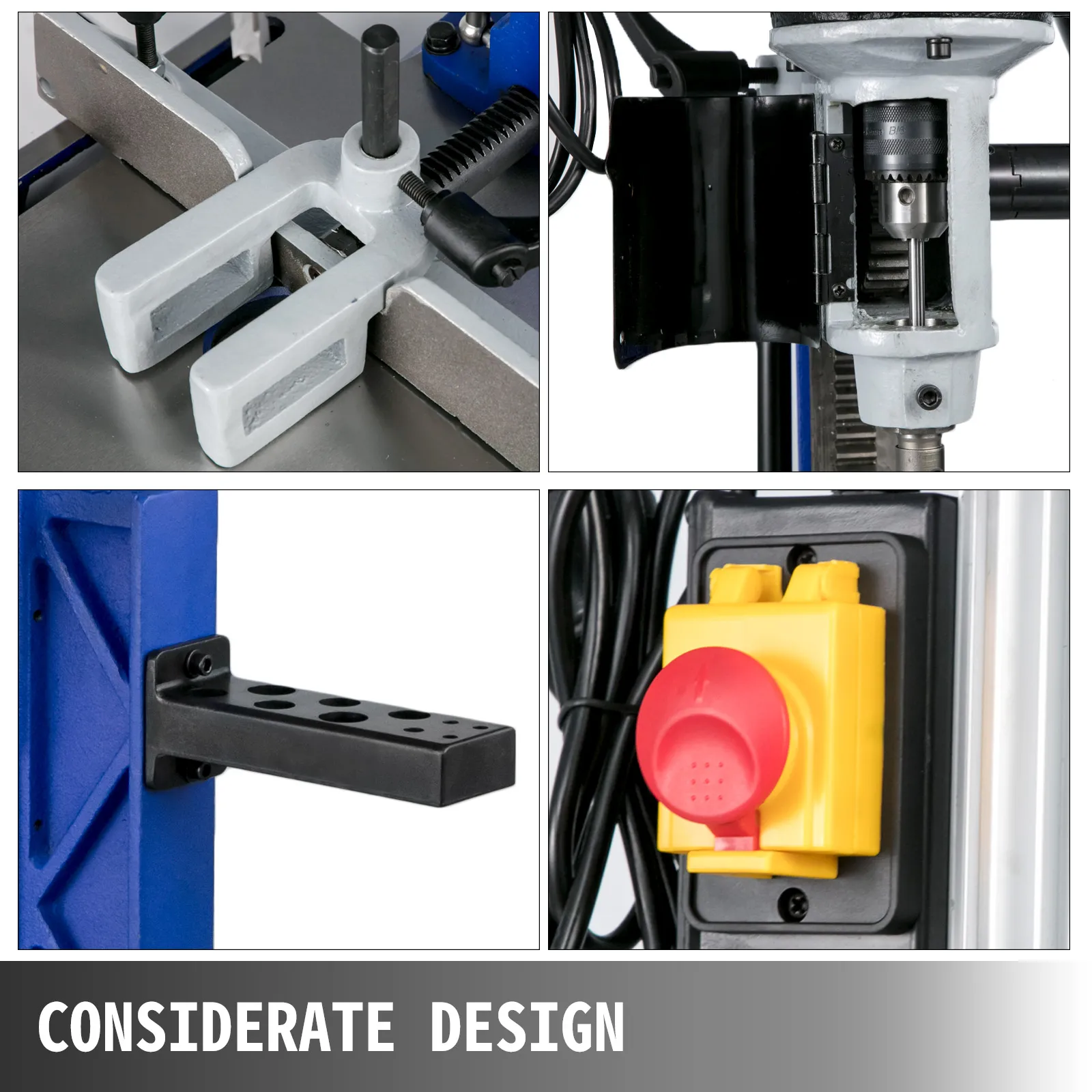 Easy and open access to drill chuck for bit changing; Large cast-iron base with center through-hole; Adjustable fence and hold down; Electromagnetic switch.