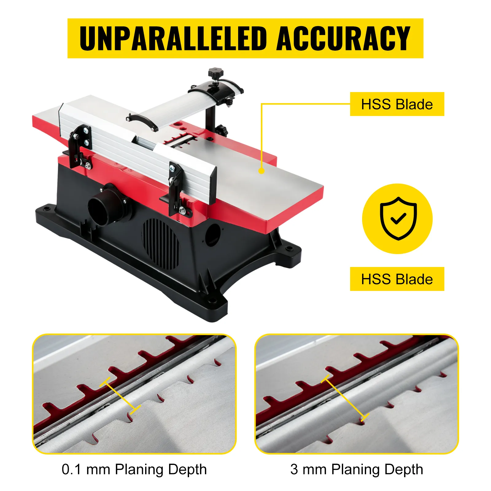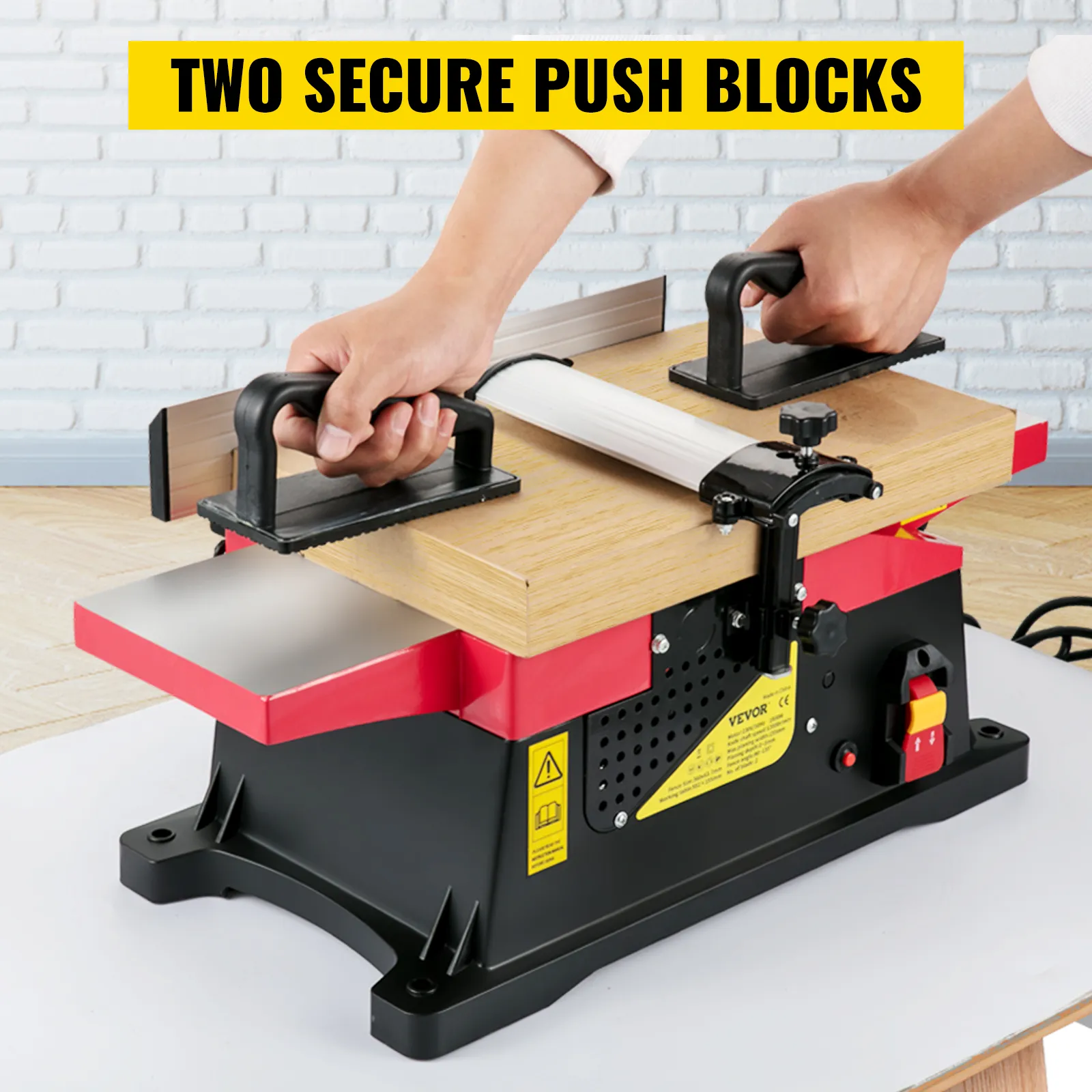 VEVOR woodworking benchtop jointers boast a sturdy, compact desktop design with 2 push blocks. It has an adjustable height knob, a powerful copper motor, two precise blades as well as other high-performance details that help you get the job done quickly and securely. Widely used in solid wood planing, construction planning wood, DIY wood products, and woodworking decoration. Capable enough to handle a range of materials and sizes.