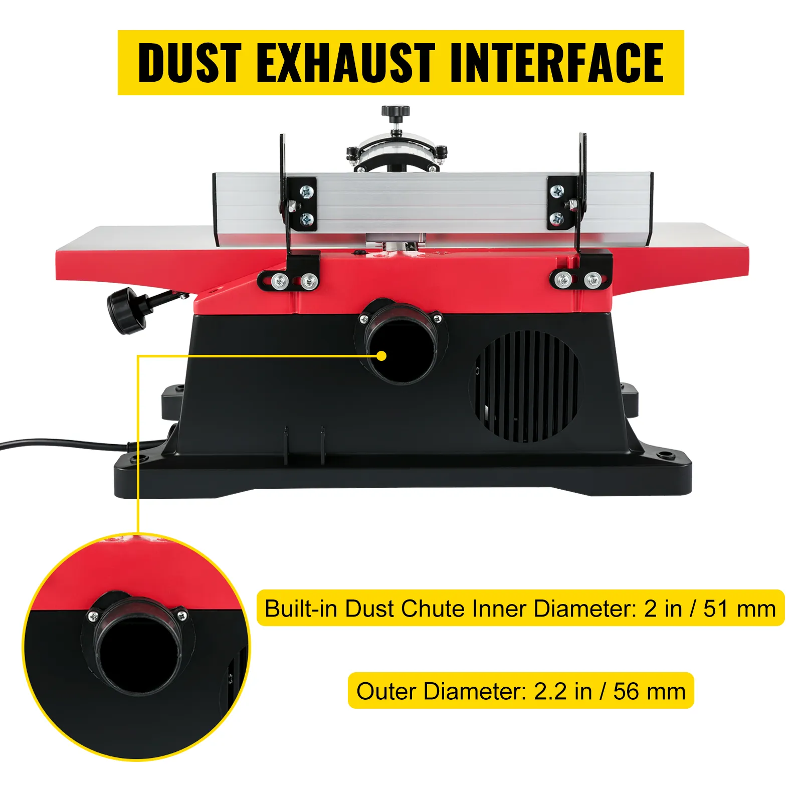 A jointer is provided which can be connected to a dust collector. This will reduce the risk of flying wood chips in the air and other dangerous inhalants. Built-in dust chute inner diameter: 2 in / 51 mm; Outer diameter: 2.2 in / 56 mm.