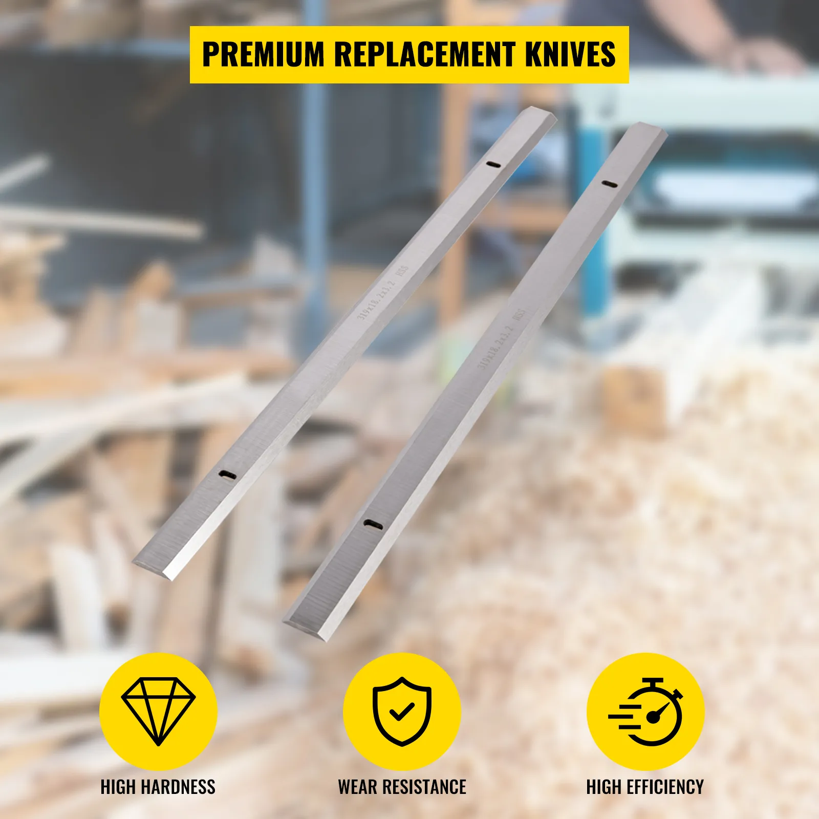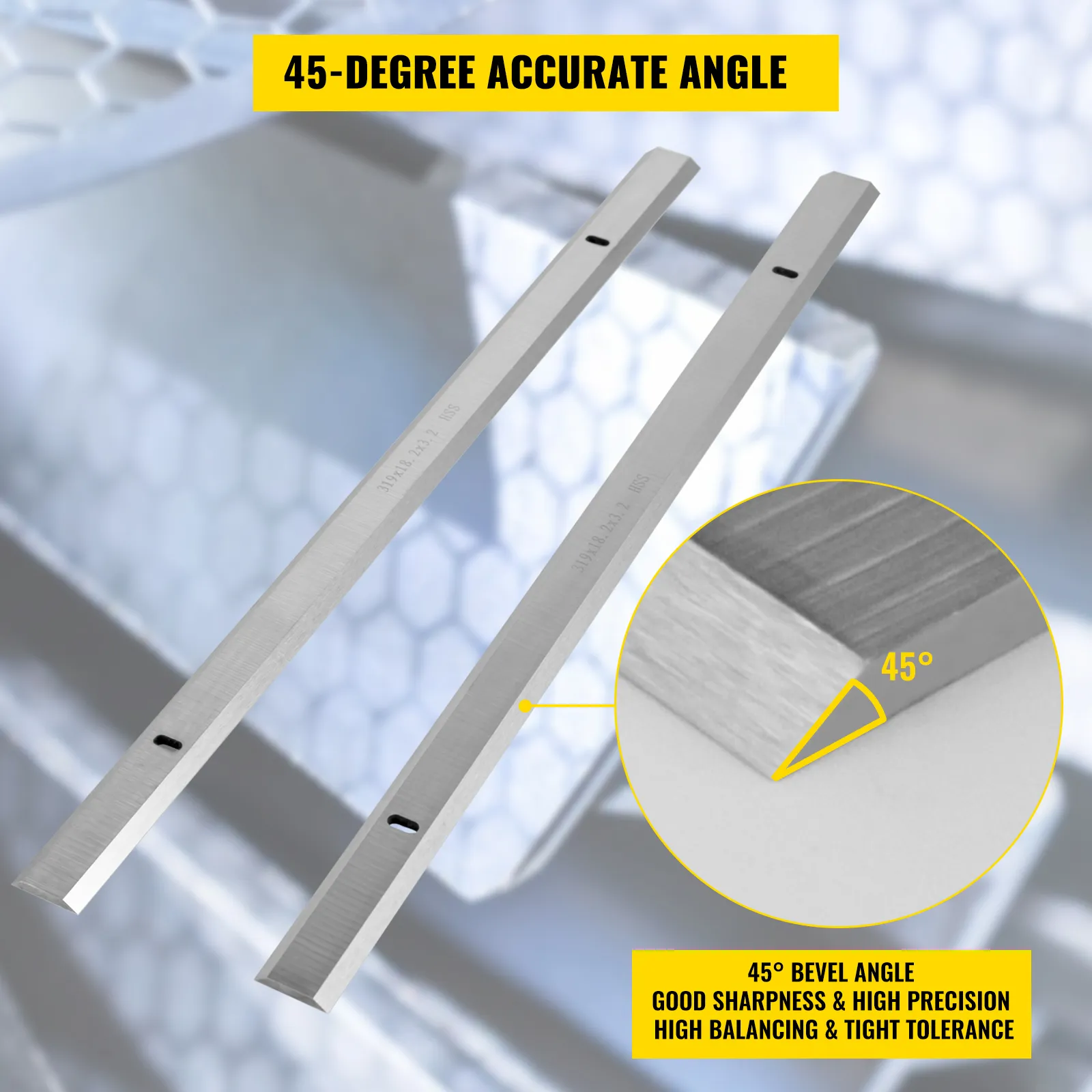 The planer blades are constructed of high-speed steel(HSS) for good sharpness, high precision, high balancing, and tight tolerance. Characterized by the excellent performance, the blades cut the wood efficiently and consistently and leave a smooth and flat surface on the woodworking workpieces, no matter it is softwood or hardwood.