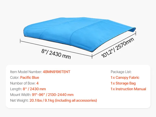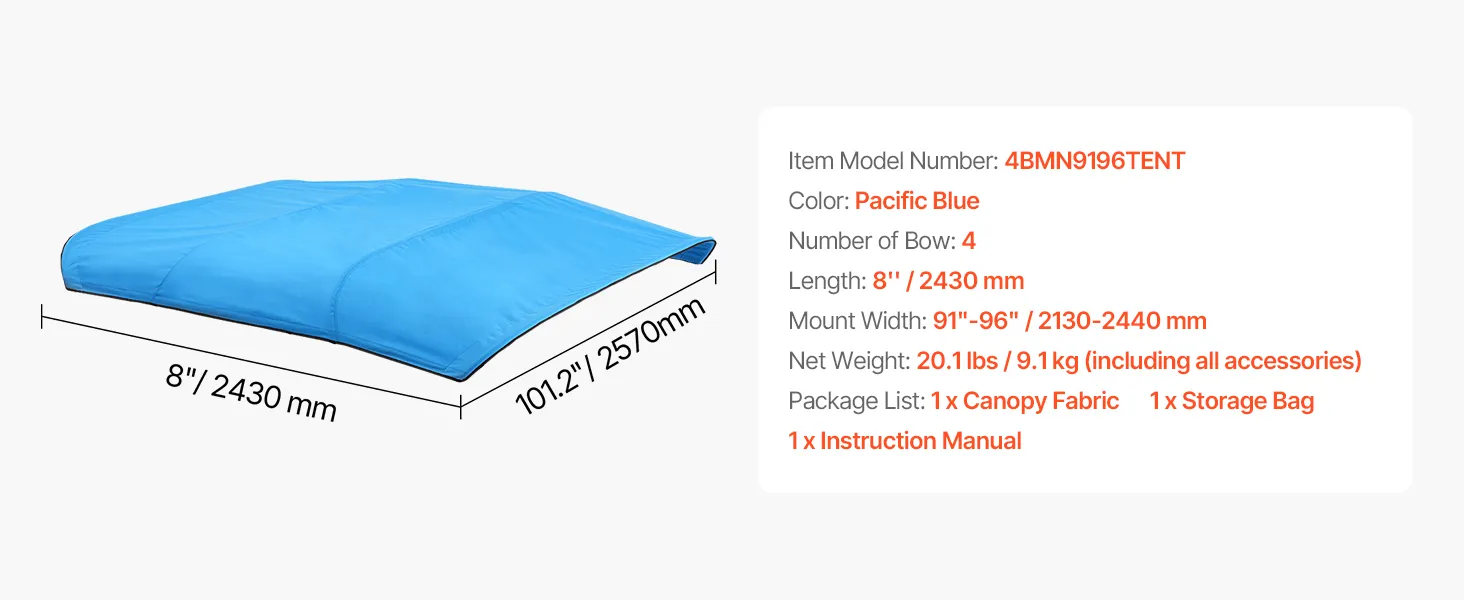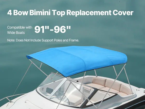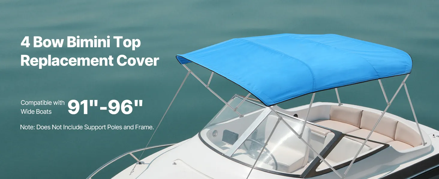 4 Bow Replacement Canopy: This boat awning measures 96"Lx(91"-96")W. You can choose the right size based on your boat and canopy dimensions. It can be seamlessly installed on various boat awning frame shapes, ensuring versatility. Note: The aluminum alloy support rods and frame are not included.