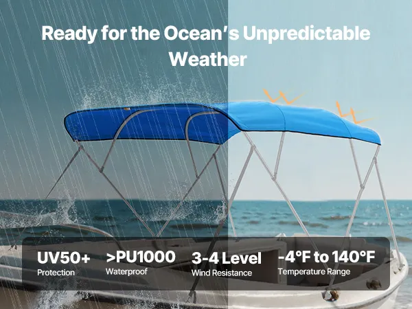 The high-density 230g/㎡ fabric with double-stitched seams ensures durability. The tensile strength of the fabric is: Warp 1050 N/5cm, Weft 850 N/5cm; Tear strength: Warp 130 N/5cm, Weft 100 N/5cm. This makes the boat awning replacement canopy strong and long-lasting.