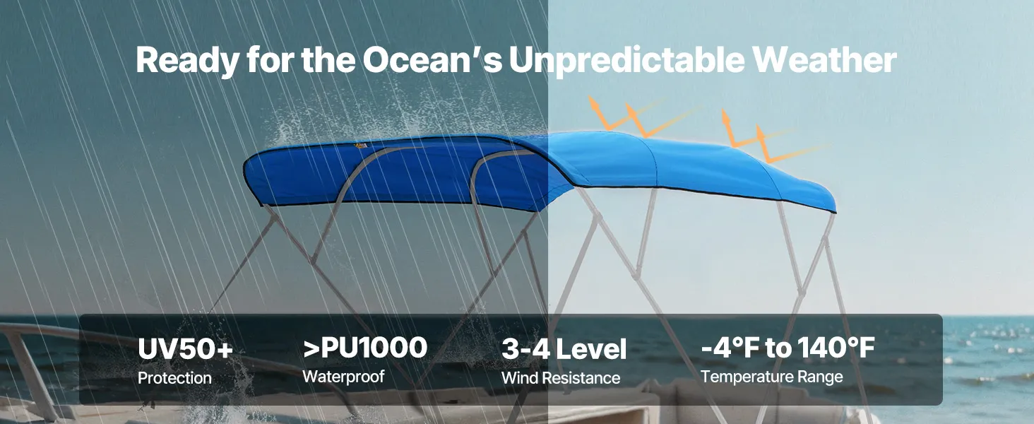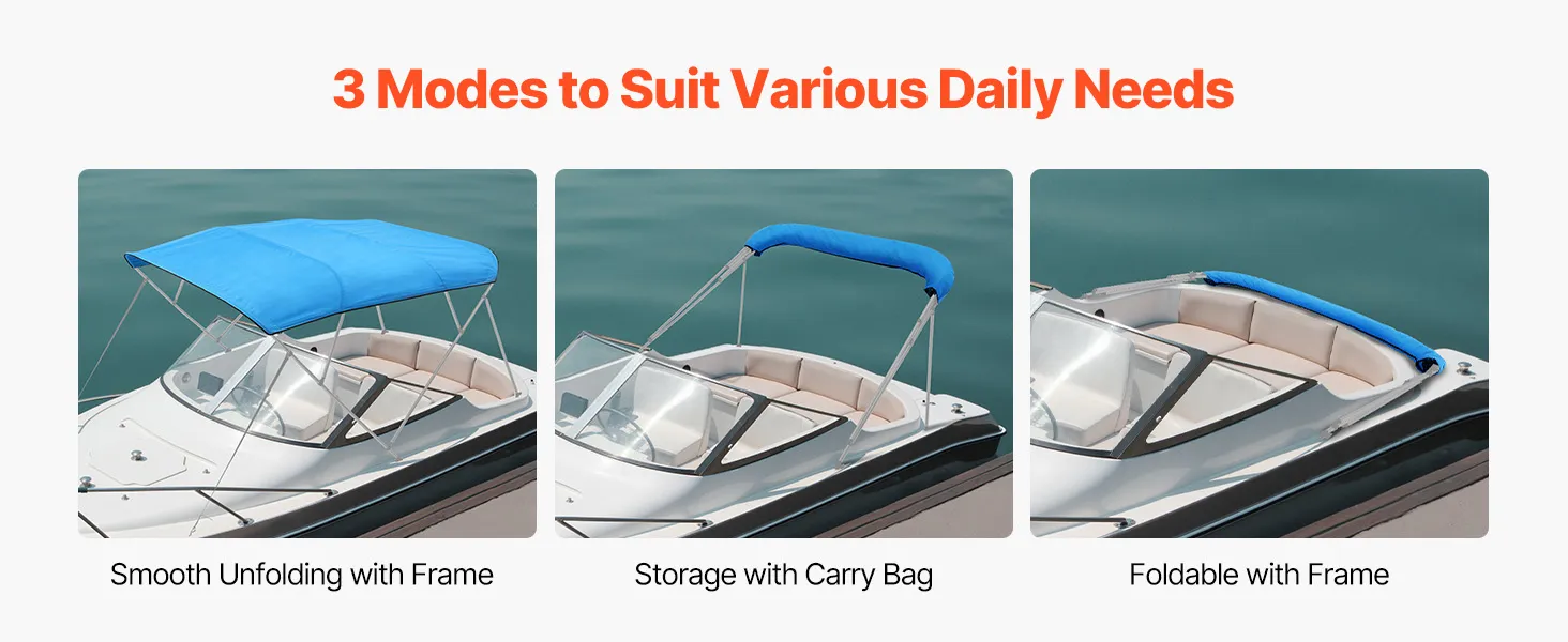 Includes Storage Bag: This boat bimini top only includes the replacement canopy, with no frame included. We provide a custom storage bag with a zipper for quick folding and easy storage. The bag helps protect the canopy from dust, UV rays, and wear, ensuring long-lasting durability.