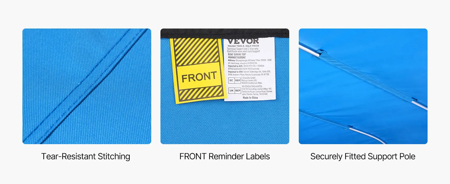 The boat bimini top comes with a "Front" label, making it easy to align and assemble quickly. This simple design minimizes installation difficulties and saves time.