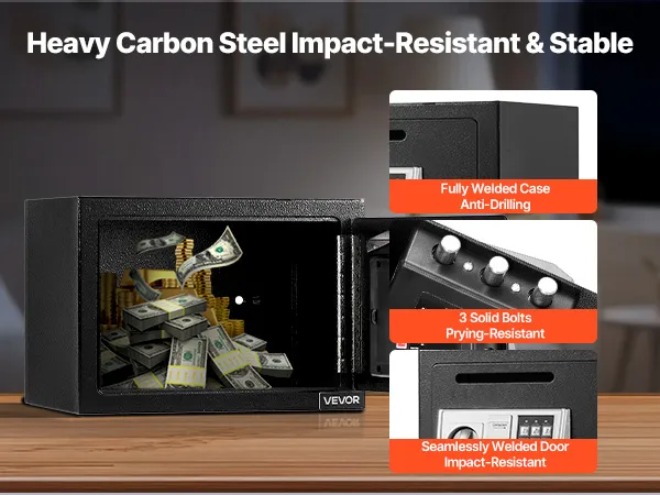 Solid Steel Construction: Crafted from carbon steel with full welding, this drop box safe is more stable than hollow safes. The solid steel door is reinforced with three 0.6 in / 1.6 cm locking bolts and anti-pry hinges against forced entry and impacts