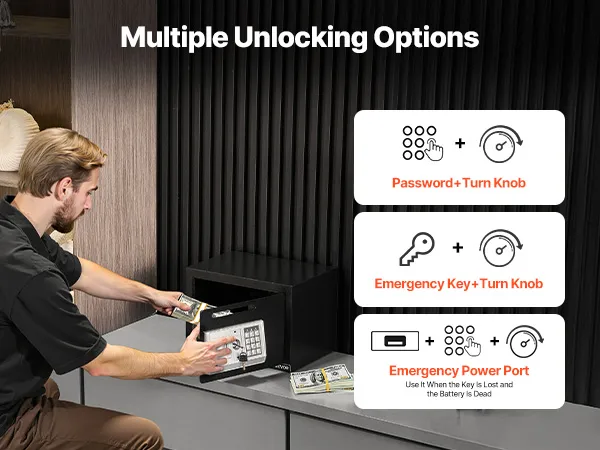 Dual Unlocking Methods: The safe with slot supports dual access: set a 1-8 digit PIN code, and use one of the two included override keys if you forget the code or the batteries run out. An emergency power supply port also allows charging and access