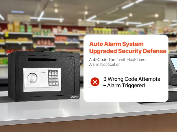 Security Alarm System: Equipped with a tamper alert system, the cash drop box will give a loud, continuous alarm after 3 incorrect password attempts. This deterrent is designed to stop potential intruders and alert you to any unauthorized access attempts