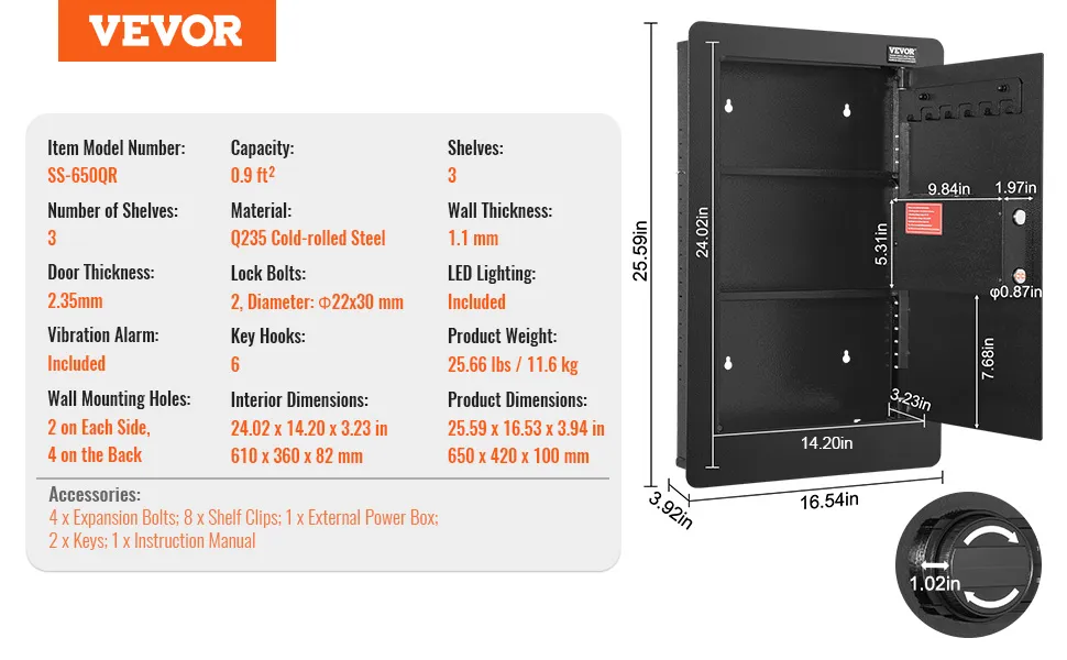VEVOR 25.59" Tall Wall Safe, 3-Tier Hidden Wall Safe with Keypad, 3 Removable Shelves & 6 Key Holders, Q235 Cold-Rolled Steel In Wall Safe with LED Light & Vibration Alarm for Money, Jewelry, Passport