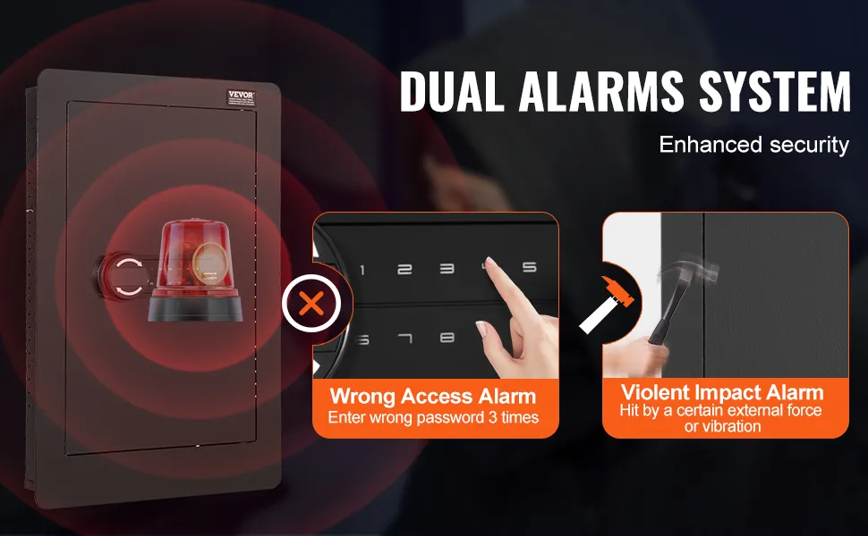 Emits an alarm if incorrect passwords are entered three times consecutively or if the wall safe box is subjected to strong impacts, offering comprehensive protection for your property.