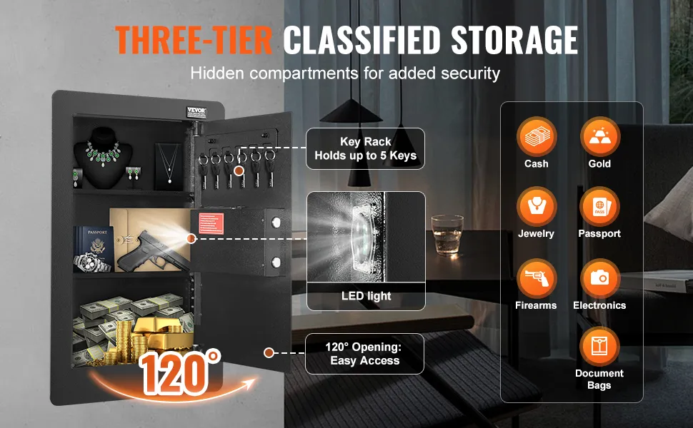 VEVOR 25.59" Tall Wall Safe, 3-Tier Hidden Wall Safe with Keypad, 3 Removable Shelves & 6 Key Holders, Q235 Cold-Rolled Steel In Wall Safe with LED Light & Vibration Alarm for Money, Jewelry, Passport VEVOR 25.59" Tall Wall Safe, 3-Tier Hidden Wall Safe with Keypad, 3 Removable Shelves & 6 Key Holders, Q235 Cold-Rolled Steel In Wall Safe with LED Light & Vibration Alarm for Money, Jewelry, Passport