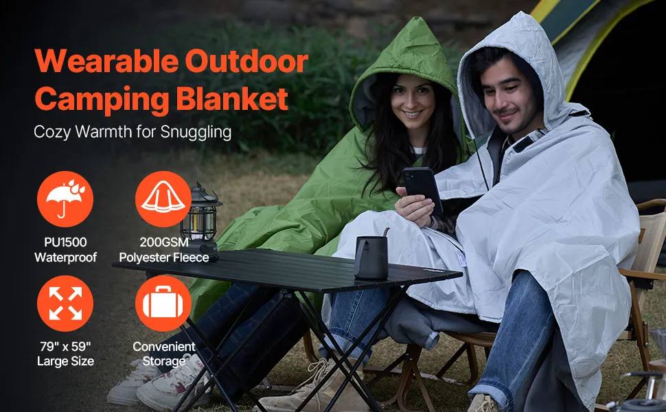 Wearable Design: Featuring 6 hook & loop fasteners, this blanket can transform into a warm outdoor cloak that shields you from the wind and cold. Plus, it frees your hands, making you stay warm while organizing your gear or preparing meals on car camping trips