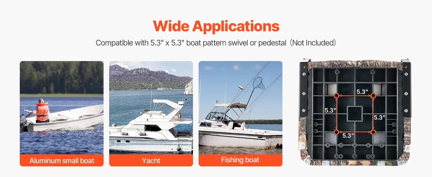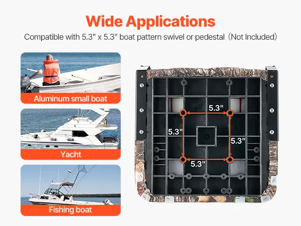 The bottom mounting holes are 5.3 inches x 5.3 inches, allowing you to place the fishing boat seat directly on the platform or mount it on most support bases. Please note: rotating bases and support bases are not included.