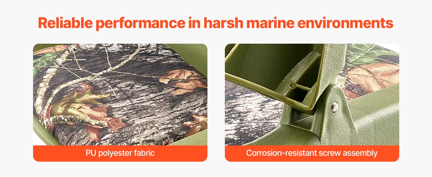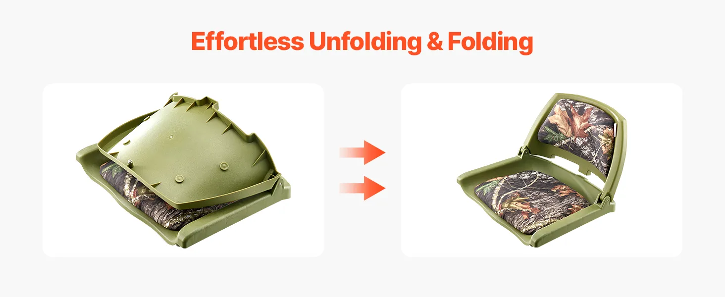 Stable and Durable: The PP frame of our folding fishing boat seat, assembled with corrosion-resistant screws, provides firm support. It ensures the seat won’t deform, break, or bend, even when leaning back fully.