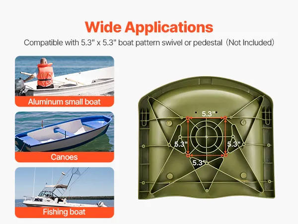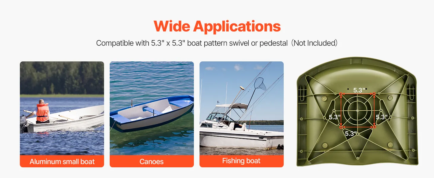 5.3" x 5.3" Bolt Hole Installation: The folding boat seat features a 5.3" bolt hole spacing. We provide corrosion-resistant screws and washers, making it easy to securely attach the seat to most boat swivels or bases. Please note, the boat base and swivel are not included.