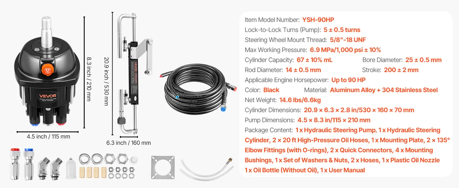 VEVOR Hydraulic Steering Kit, 90 HP, Marine Boat Hydraulic Steering System, with 6.9 MPa/1000 psi Helm Pump, Two-Way Lock Cylinder, and 6 m High-Strength Hoses, for Single Station, Single-Engine Use