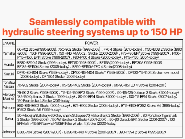 Q: How do I know if this hydraulic steering kit fits my outboard model? A: We provide detailed compatibility images on the product page. Simply compare your outboard model with the chart shown to confirm the correct match before purchasing.