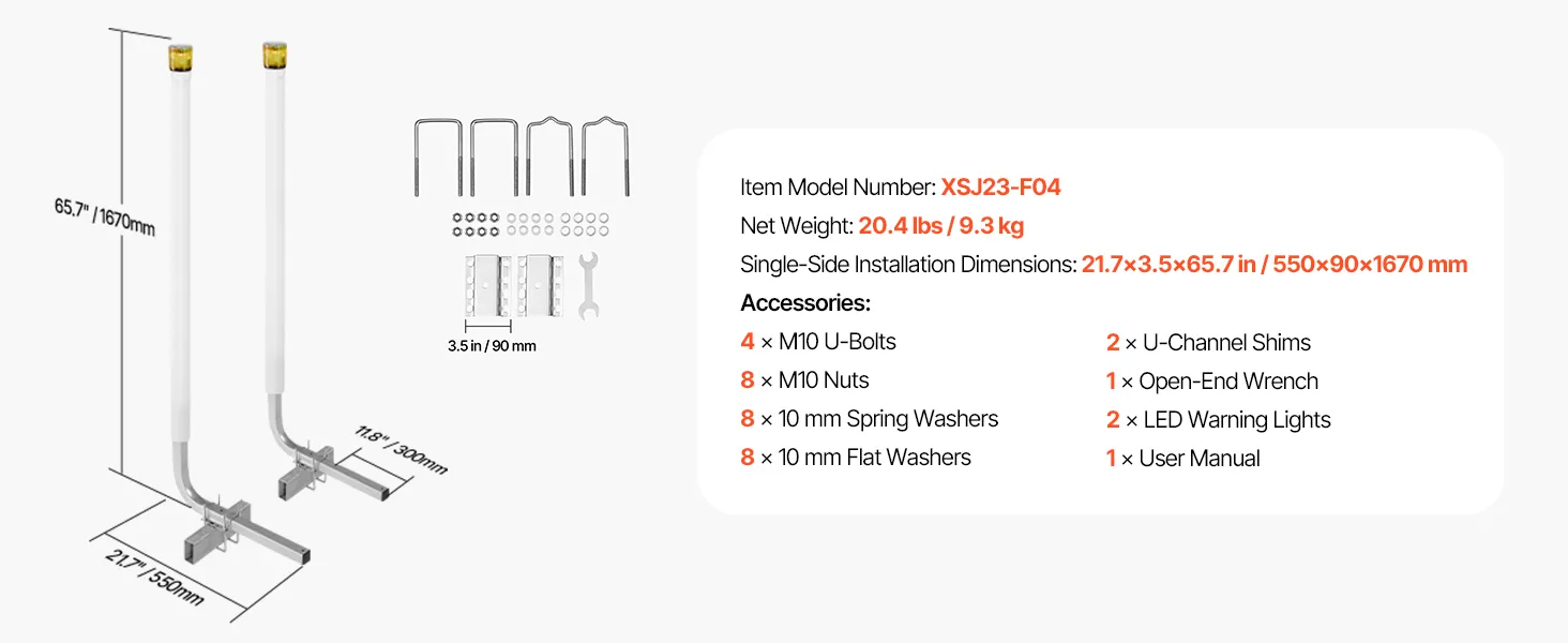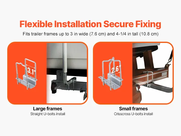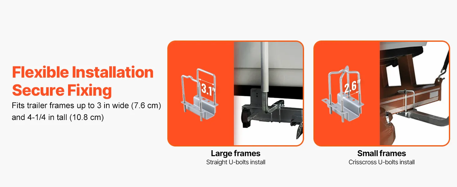 Sturdy Installation Design: VEVOR boat trailer fits mounting beams with a max cross-section of W ≤ 3 in (7.6 cm) and H ≤ 4-1/4 in (10.8 cm). Two flexible mounting options plus heavy-duty bolt fastening keep the guide posts securely in place and help reduce loosening from vibration or impact