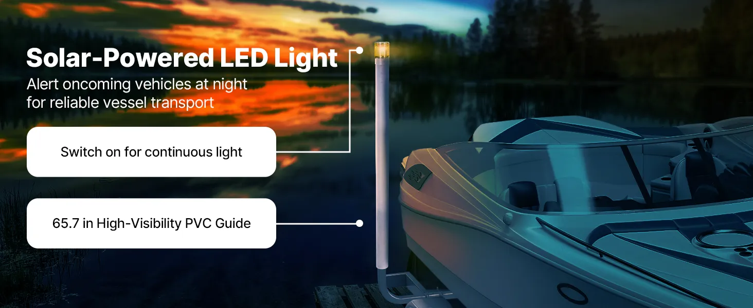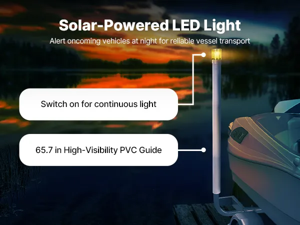 Solar-Powered LED Light: A solar-powered LED light is mounted on top of the boat trailer guide post. Turn on the switch for steady-on lighting. With a 1000 mAh AA high-capacity battery, one day of charging provides 4–6 hours of continuous light, keeping your guide-ons clearly visible at night to alert approaching vehicles and make your trailer easier to spot