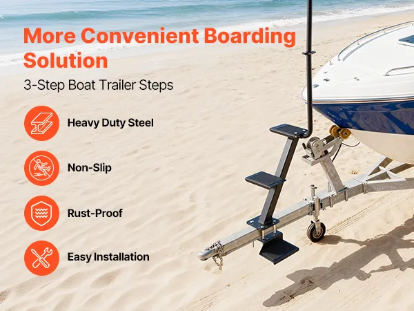 Our boat trailer steps feature heavy-duty carbon steel and a triangular support structure for stable load-bearing. The rust-resistant surface withstands seawater, while the non-slip mat ensures confident footing. The adjustable bracket fits 3 trailer crossbeams and is easy to install.