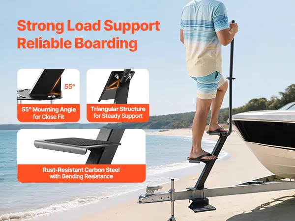 The 55° close-fit installation angle and triangular structure ensure stability and no wobbling, while rust-resistant carbon steel supports long-term, reliable load capacity. This boat trailer ladder lets you board your boat steadily and securely every time.