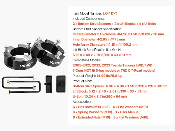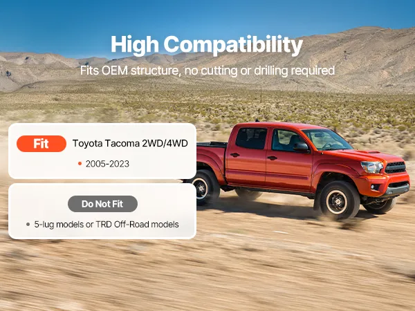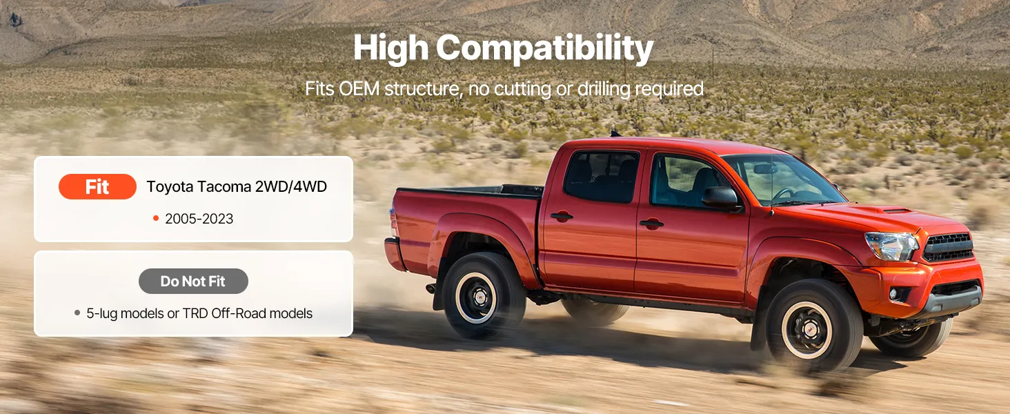Wide Compatibility: This leveling lift kit fits 2005-2021, 2022, 2023 Toyota Tacoma 2WD/4WD. Not compatible with 5-lug models or TRD Off-Road models. It precisely matches OEM structure