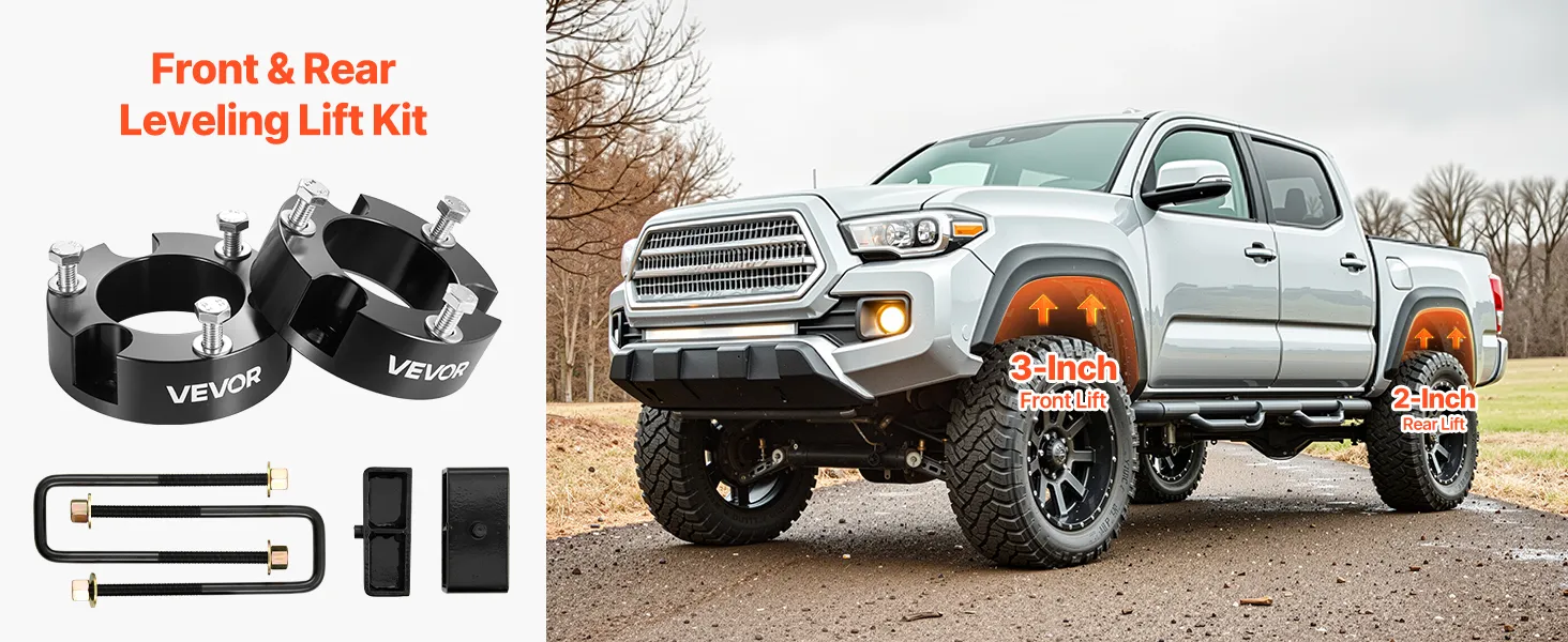 VEVOR 76.2 mm Front and 50.8 mm Rear Leveling Lift Kit for 2005-2021 2022 2023 Toyota Tacoma 2WD/4WD, Chassis Level Kit with 2 Front Strut Spacers, 2 Rear Lift Blocks, 4 U-Bolts, Suspension Level Kit