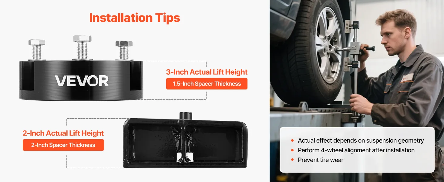 3-Inch Front & 2-Inch Rear Lift: Our level kit includes two strut spacers, two U-bolts, two lift blocks, and high-strength bolts to raise the front and rear chassis. Spacer thickness isn't actual lift height—final lift varies by suspension geometry
