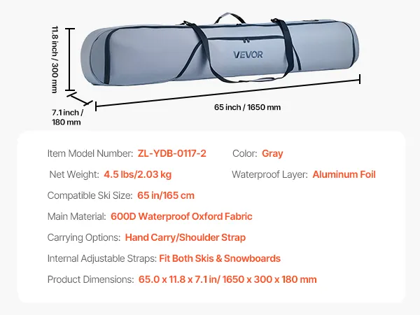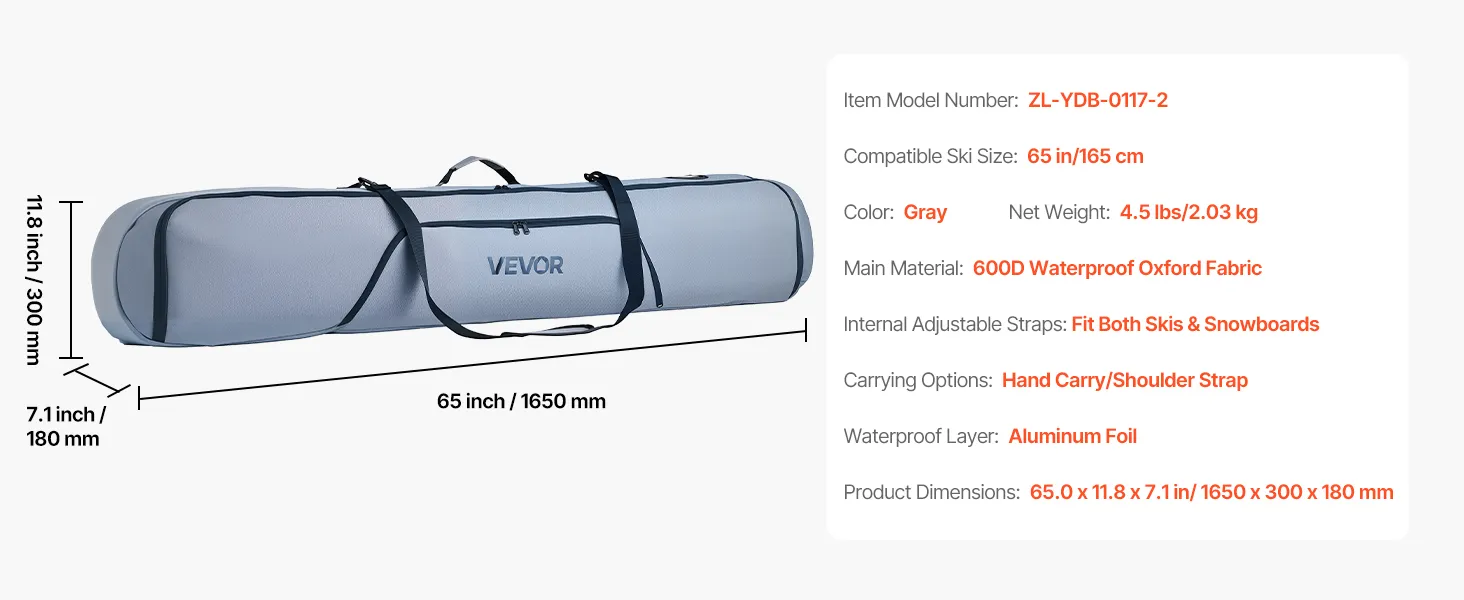 VEVOR Snowboard Bag, Up to 65 in/165 cm, Padded Skis & Snowboards Bag for Air Travel, 600D Waterproof Oxford Fabric, with Adjustable Inner Straps, for Skis Poles Goggles Gloves Helmet Boots (Gray)