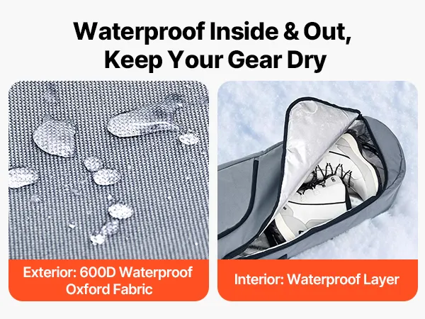 Made of lightweight 600D waterproof Oxford fabric with a protective lining, this snowboard bag for air travel keeps snow and rain out, shielding your gear from dampness and rust while making the bag easy to carry.