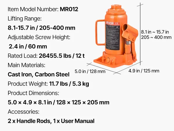 Stable Lifting: Our hydraulic bottle jack handles up to 12 tons (26,455.5 lbs), great for sedans, pickups, SUVs, small towable RVs, and minivans. It is ideal for tire changes, quick inspections, and even lifting farm equipment and construction machinery