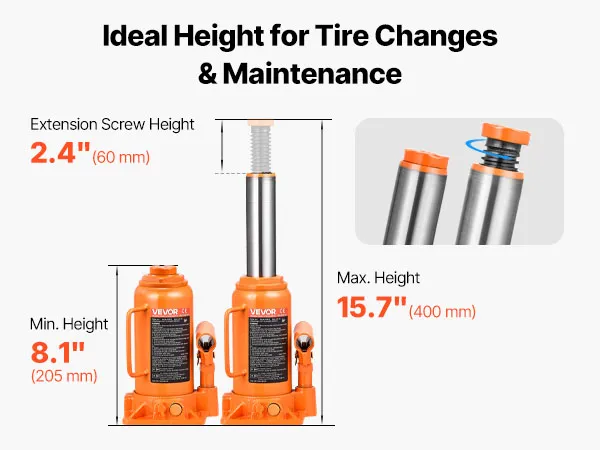 Wide Lifting Range: From low to high, this high lift bottle jack's got the range. It lifts from 8.1 in (205 mm) up to 15.7 in (400 mm), with a 2.4 in (60 mm) screw for fine-tuning the height—handy when space is tight